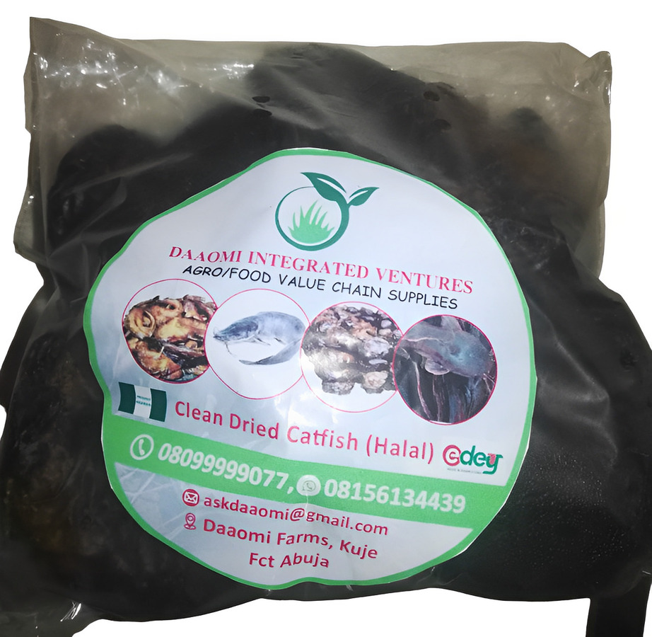 Clean Dried Catfish farmed and processed in Abuja, Nigeria. Uniquely packaged in branded breathable nylon for longer shelflife and product quality. Comes standard in 1kg plus 1 extra promo packs.